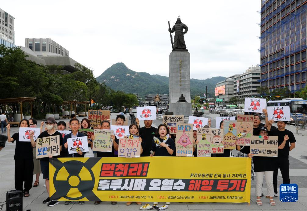 8月24日,韩国民间环保组织“环境运动联合”成员在首尔光化门广场集会,抗议日本核污染水排海。