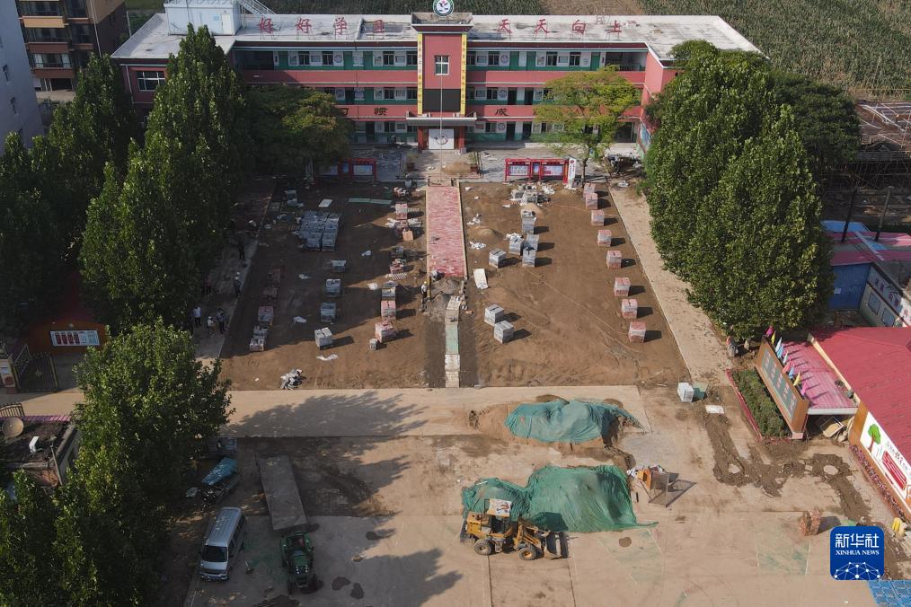8月24日,施工人员在河北省邢台市宁晋县大曹庄镇中心小学修缮学校路面(无人机照片)。