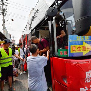 8月20日,在天津市静海区台头镇,村民有序下车准备回家。新华社记者孙凡越 摄