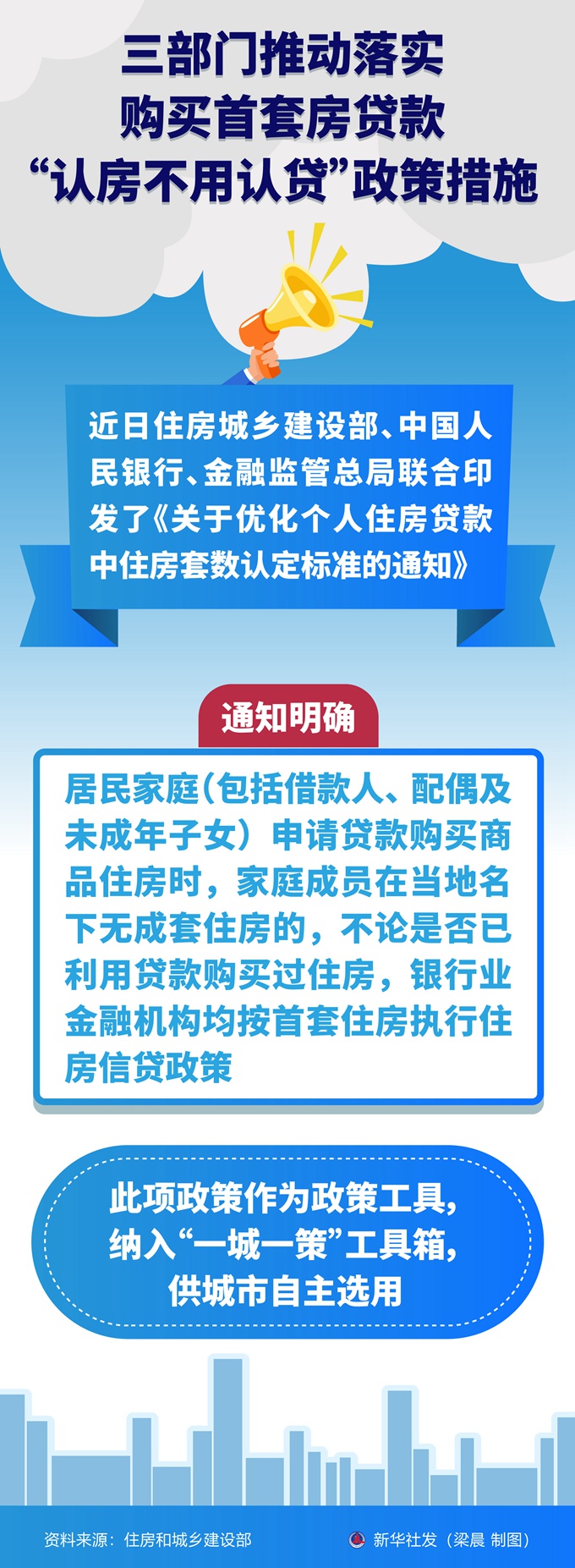 新华社北京8月25日电(记者王优玲)记者25日从住房和城乡建设部获悉,近日住房城乡建设部、中国人民银行、金融监管总局联合印发了《关于优化个人住房贷款中住房套数认定标准的通知》,推动落实购买首套房贷款“认房不用认贷”政策措施。