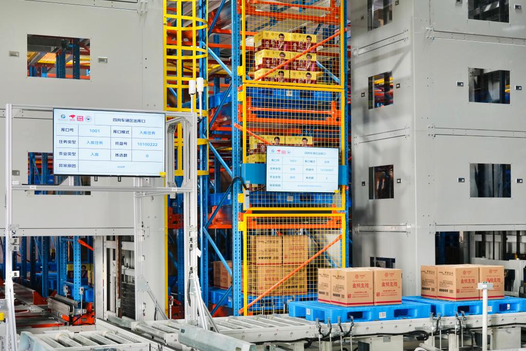 西藏林芝农产品前置智能仓内,林芝松茸酱油货物正在整托出库。(李昕玮 摄)