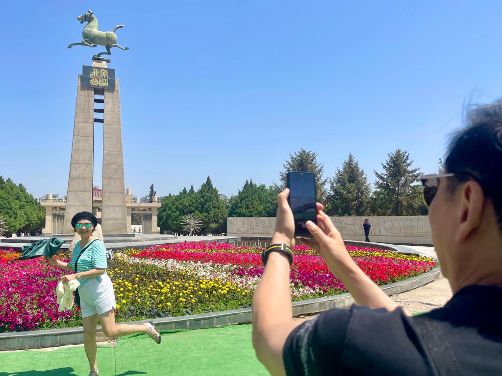 游客在甘肃省武威市天马大景区“马踏飞燕”拍照留念(2023年6月16日摄)。新华社记者 郭刚 摄