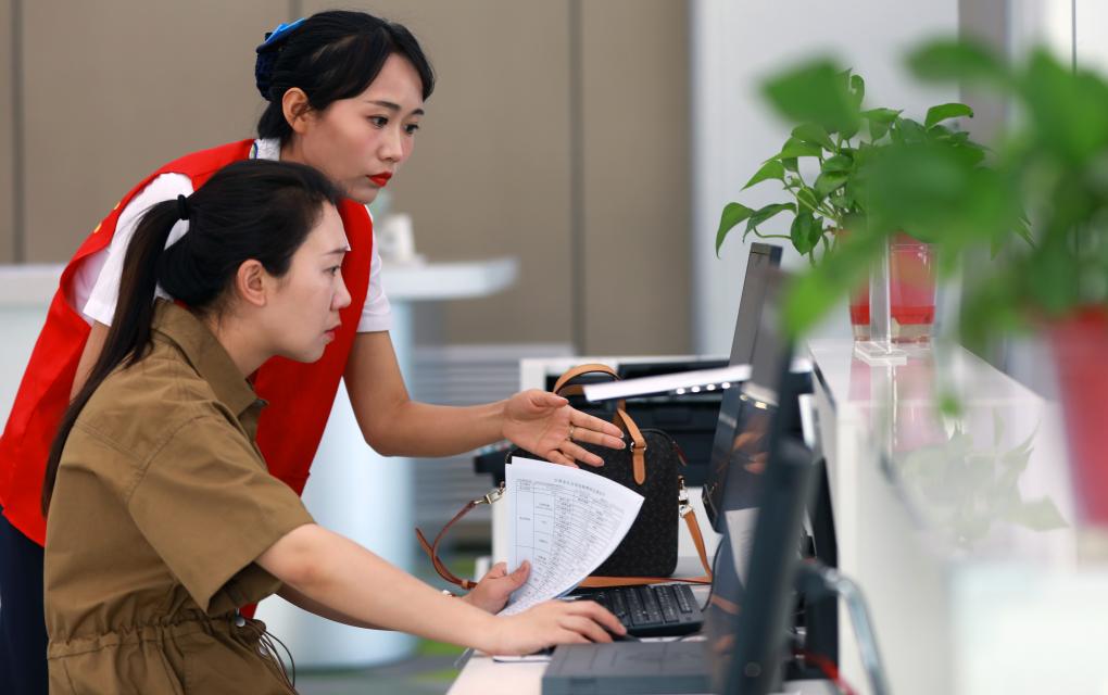 在甘肃省武威市政府政务服务中心,志愿者(后)在为市民办理业务提供服务(2023年6月16日摄)。新华社记者 郭刚 摄