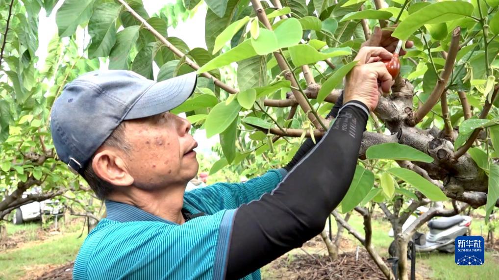 果农蔡鸿义在为番荔枝授粉(8月9日摄)。新华社记者 王承昊 摄
