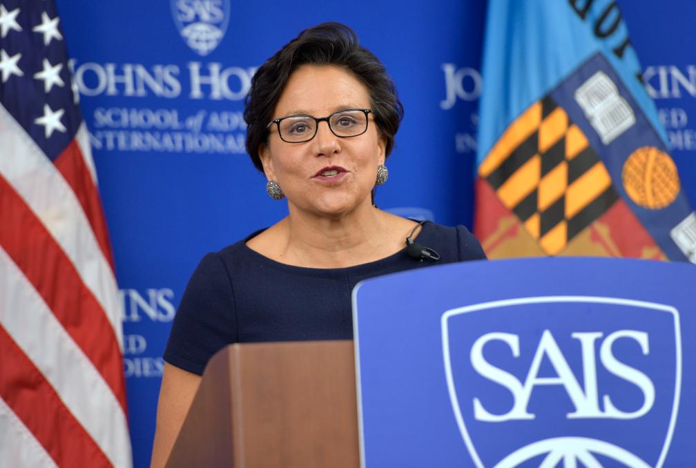图为2014年4月17日在约翰斯·霍普金斯大学拍摄的时任美国商务部长彭妮·普里茨克发表演讲的资料照片。新华社记者鲍丹丹摄