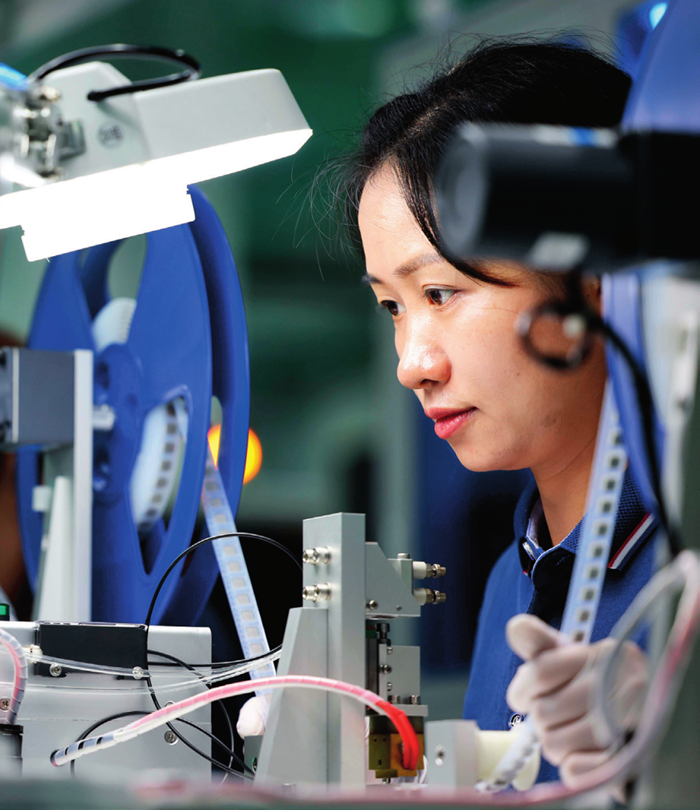 在合肥市瑶海区长三角数字科技示范园,一家电子科技企业的工作人员对电子元件产品进行检测(2023 年 6 月 25 日摄)解琛摄 / 本刊