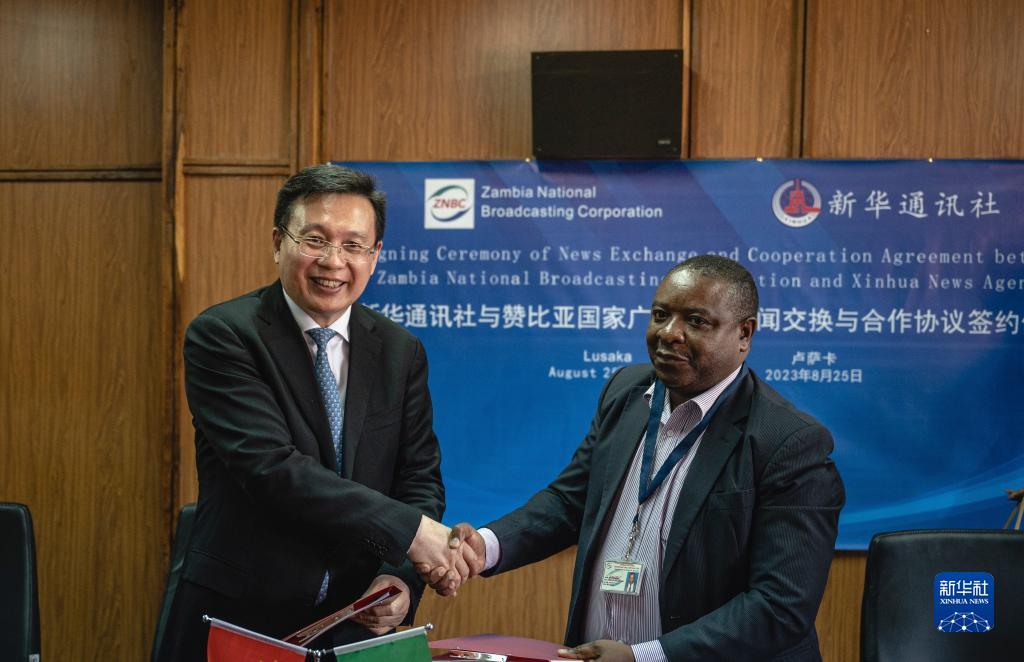 8月25日,正在赞比亚访问的新华社社长傅华在卢萨卡与赞比亚国家广播公司代理台长布莱特·恩卡卡会见并签署协议。新华社记者 王冠森 摄