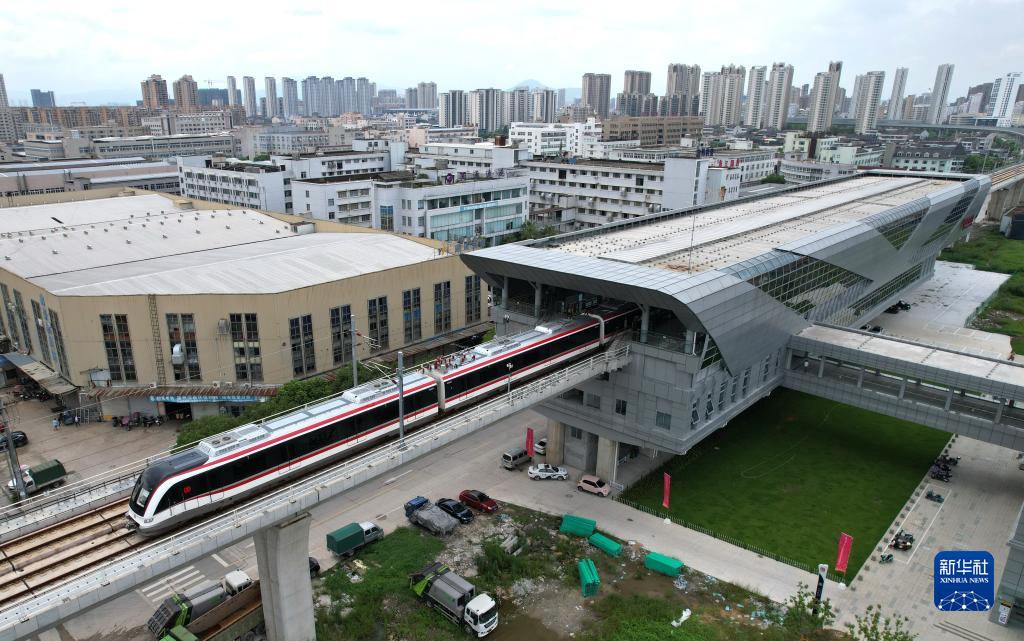 8月26日,温州轨道交通S2线列车驶出瑞安市上东路站(无人机照片)。新华社发(庄颖昶 摄)