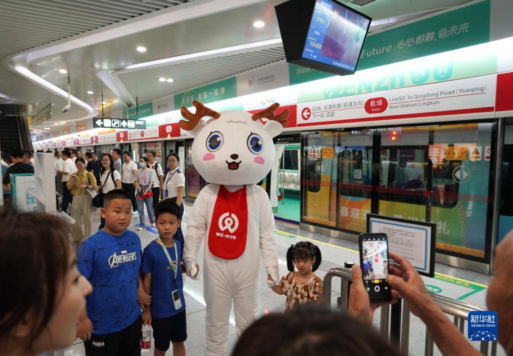 8月26日,在温州S2线机场站,乘客在与吉祥物合影。新华社发(苏巧将 摄)