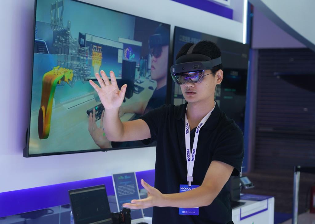 8月26日,在HICOOL2023全球创业者峰会展览展示区,工作人员通过AR设备观察计算机辅助工程的计算结果。新华社记者 任超 摄