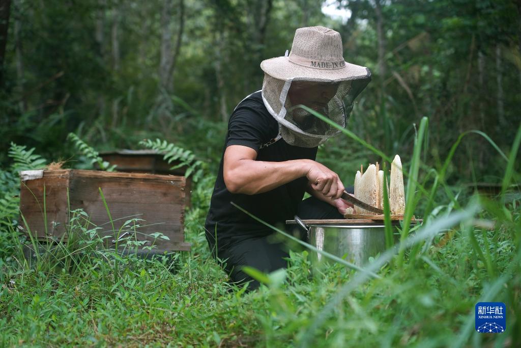村民刘煌平在收获蜂蜜(8月24日摄)。
