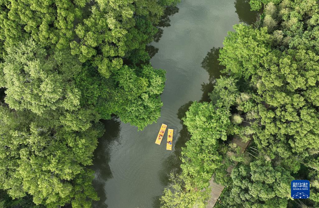 游客在港背村的小溪里体验竹筏漂流(8月24日摄,无人机照片)。