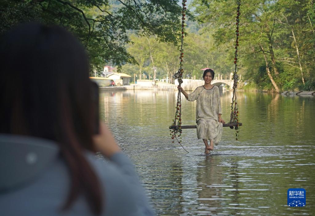 游客在港背村的网红水上秋千打卡留影(8月24日摄)。