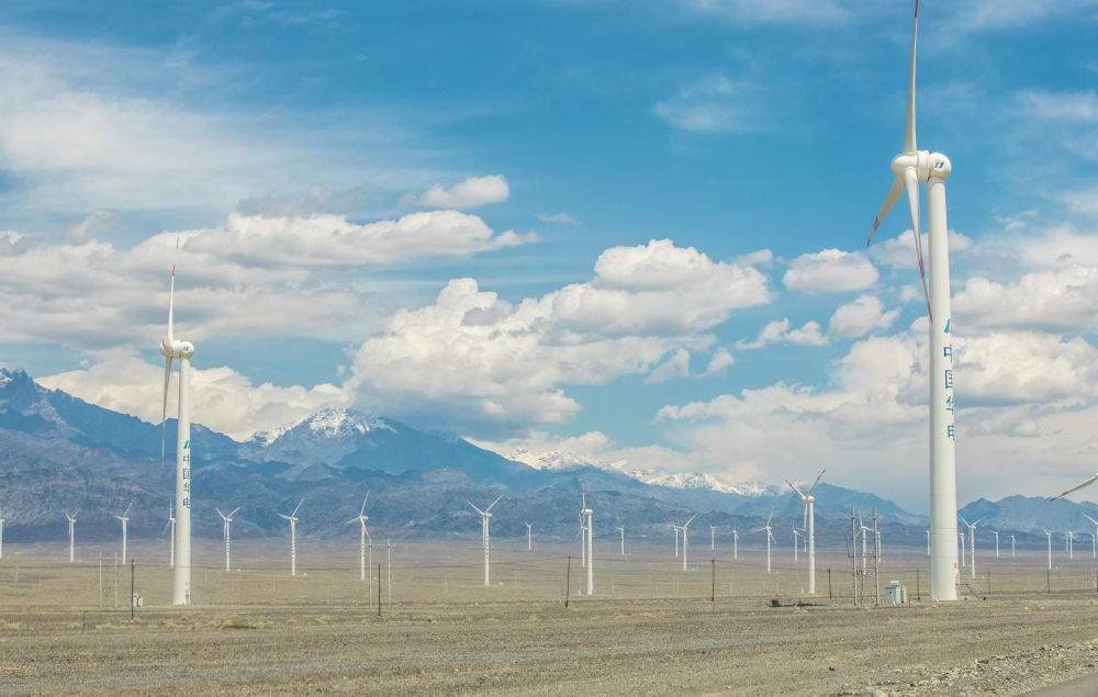 新疆乌鲁木齐达坂城片区风机与雪山交相辉映(2023年7月12日摄)。新华社发(王晋魁 摄)