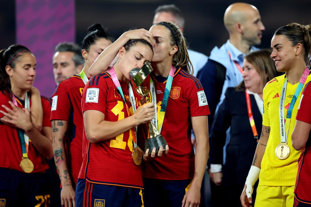 8月20日,西班牙队球员珍妮弗·埃尔莫索(前左)与队友在颁奖仪式上亲吻冠军奖杯。新华社记者丁旭摄