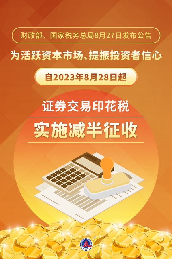 新华社北京8月27日电 记者27日从财政部了解到,财政部、国家税务总局当日发布公告称,为活跃资本市场、提振投资者信心,自2023年8月28日起,证券交易印花税实施减半征收。
