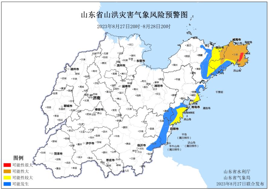 此外,山东省水利厅和山东省气象局联合发布了山东省山洪灾害气象预警,预计8月27日20时至8月28日20时,威海荣成市中西部地区发生山洪灾害的可能性很大(红色预警);威海荣成市大部、文登区大部、乳山市中北部、环翠区和烟台牟平区东部等地发生山洪灾害的可能性大(橙色预警)。此外,威海、烟台、青岛等市局部地区发生山洪灾害的可能性较大(黄色预警);威海、烟台、青岛、潍坊、日照、临沂等市局部地区可能发生山洪灾害(蓝色预警),提醒各地注意做好实时监测、防汛预警和转移避险等防范工作。