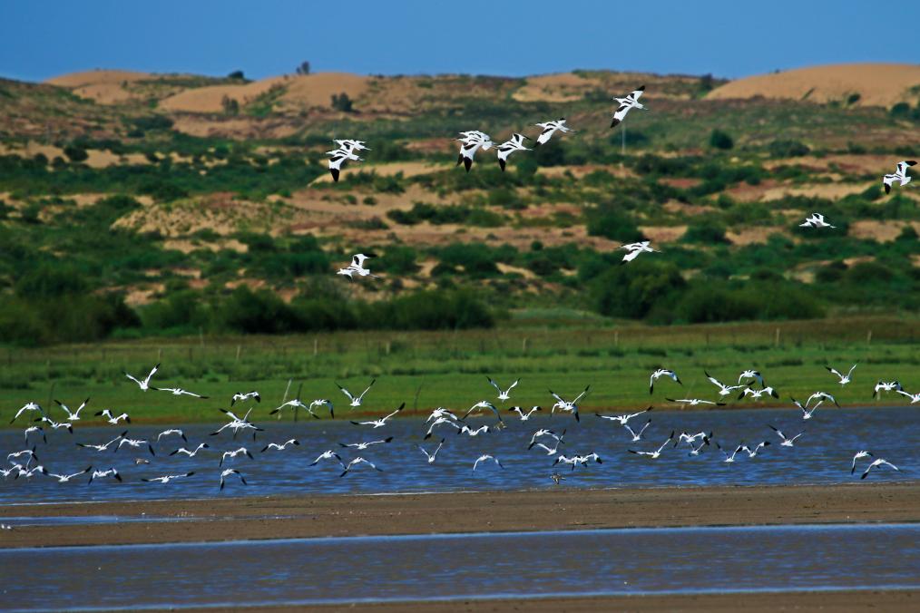 这是鄂托克草原上鸟儿在水面飞翔。(郝常明 摄)