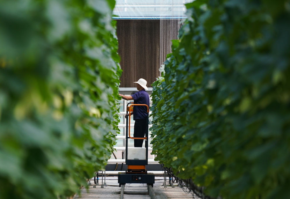 2023年7月26日,在山东潍坊寿光市丹河设施蔬菜标准化生产示范园,农民在管护作物。新华社记者 张浩波 摄