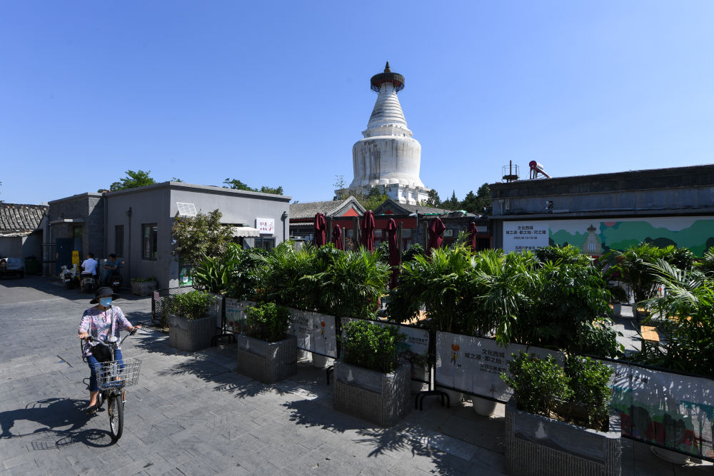 午后的北京西城区宫门口西岔胡同,居民们纳凉聊天,一间间老字号烧饼店、特色咖啡厅、精酿啤酒馆各成风景。抬头望去,青砖灰瓦与红墙绿树之上,妙应寺白塔庄重沧桑,古朴与现代相映成趣。