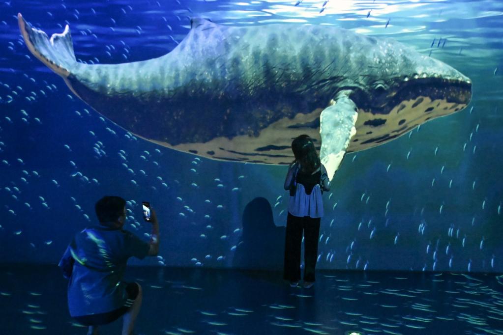 正值大型沉浸式互动数字艺术作品《鲸奇物语》光影艺术展首展上映,国家海洋博物馆里人头攒动。