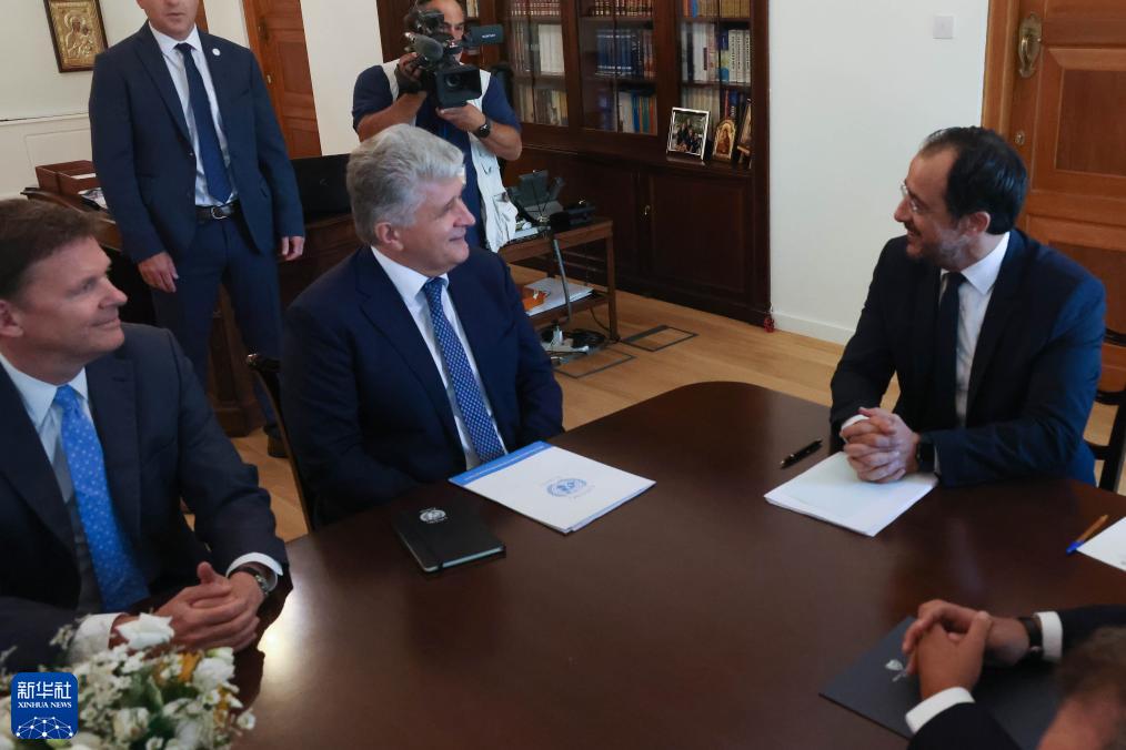 8月28日,在塞浦路斯尼科西亚,联合国负责欧洲、中亚和美洲事务的助理秘书长米洛斯拉夫·延恰(前中)与塞浦路斯希腊族领导人、总统赫里斯托祖利季斯(前右)举行会谈。新华社发(塞浦路斯新闻局供图)