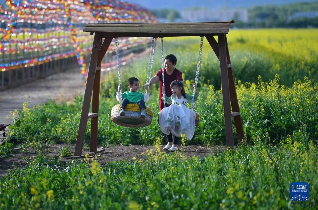 小朋友在新疆伊犁哈萨克自治州昭苏县油菜花田里荡秋千(7月17日摄)。