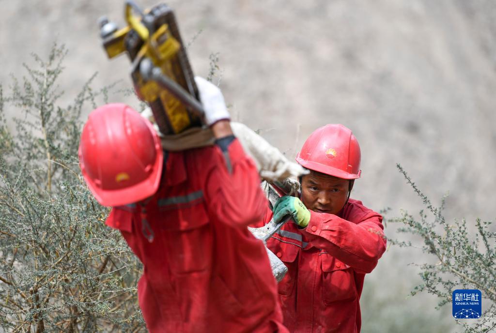 新疆西天山深处,东方物探公司塔里木物探处2170队的钻工谭金龙(后)和工友一起扛着钻井设备上山(6月18日摄)。