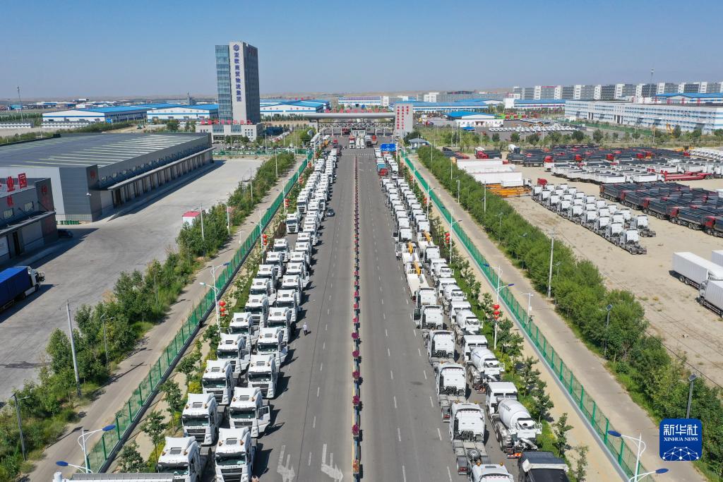 国产商品车排队进入新疆霍尔果斯综合保税区(7月26日摄,无人机照片)。