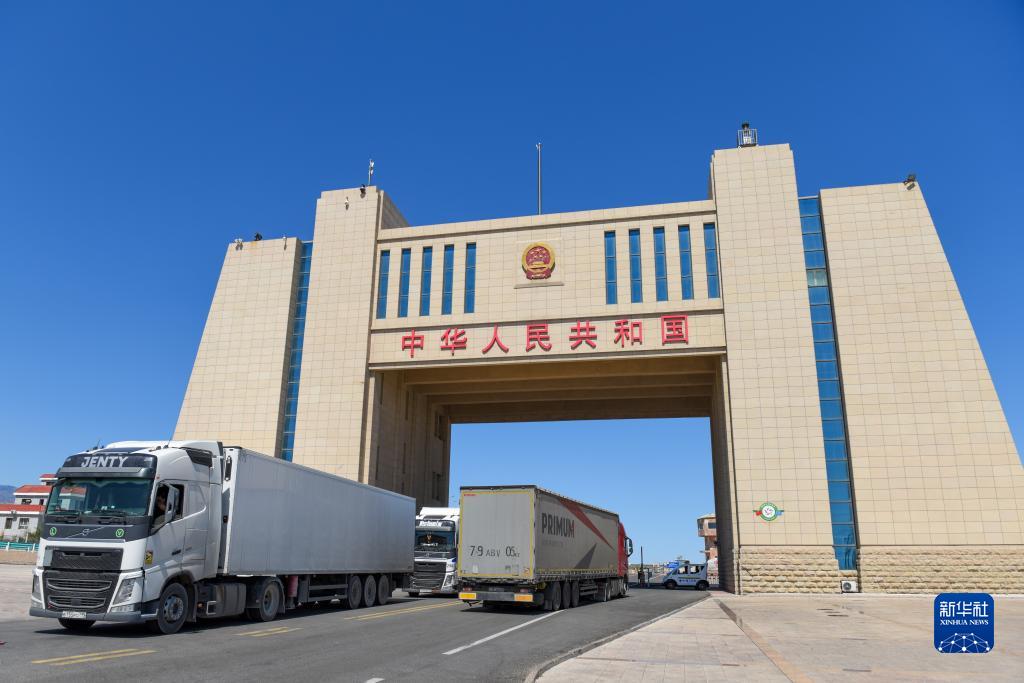 新疆阿拉山口口岸,几辆货车在进出国门(7月24日摄)。2023年上半年,阿拉山口口岸跨境电商累计出口包裹1450.24万票,完成贸易额16.77亿元,同比增长10.3%。