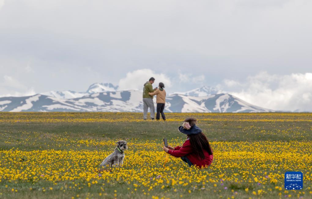 游客在新疆赛里木湖景区拍照(5月21日摄)。