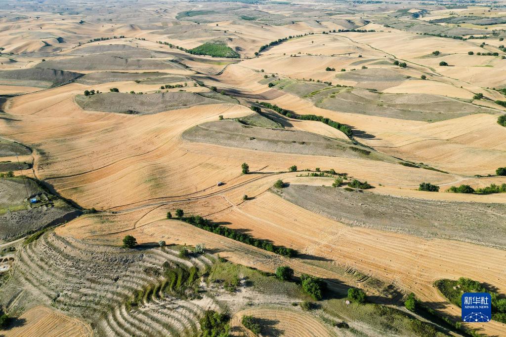 新疆昌吉回族自治州木垒哈萨克自治县的麦田(7月23日摄,无人机照片)。