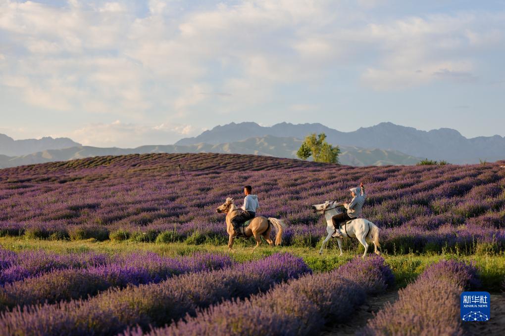 游客在新疆霍城县芦草沟镇四宫村的薰衣草农场骑马游玩(7月14日摄)。