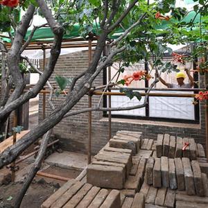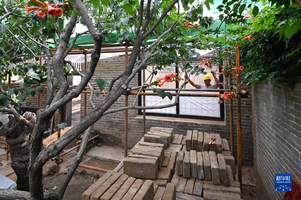 8月29日,工人在李大钊故居维修保护工程工地施工。