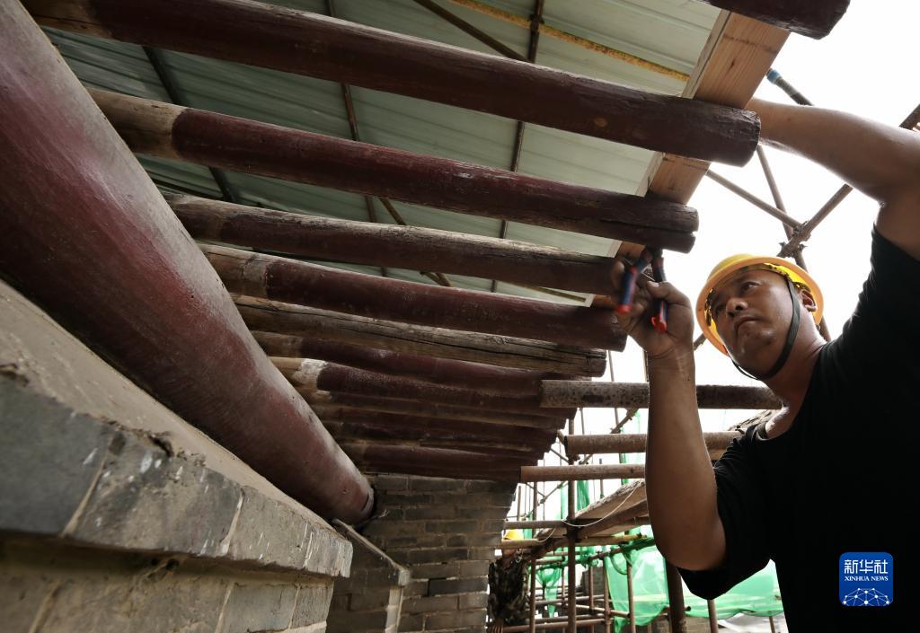 8月29日,工人在李大钊故居维修保护工程工地施工。