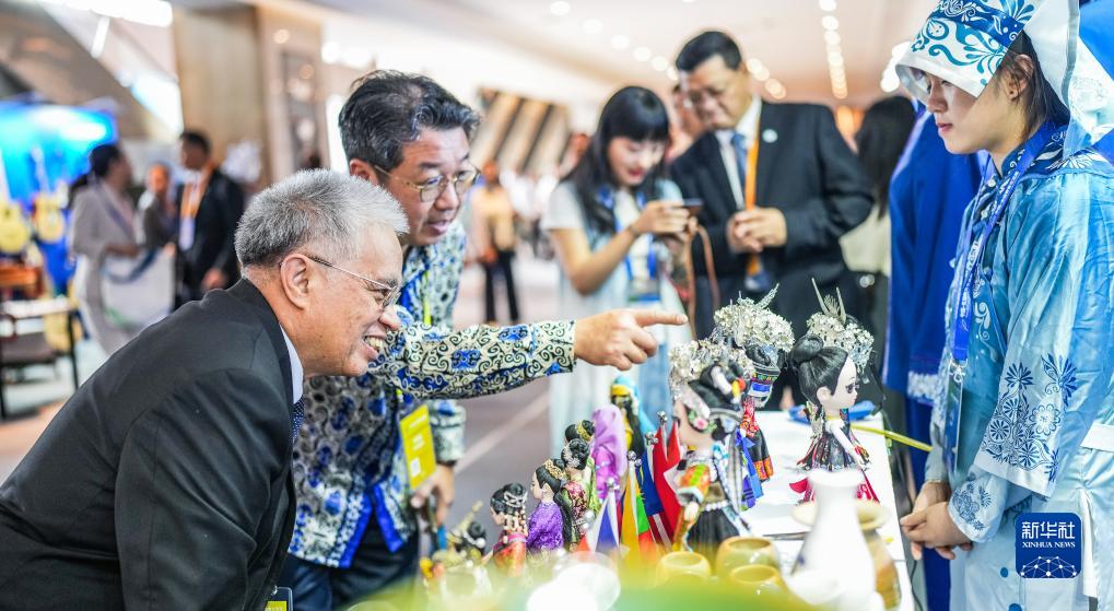 8月29日,参会嘉宾在交流周活动上参观工艺作品。