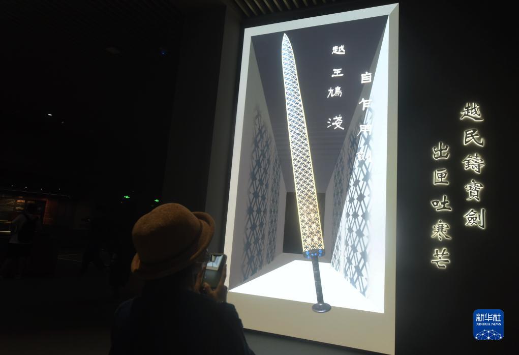8月29日,参观者在浙江省博物馆新馆观看利用裸眼3D技术展示的越王者旨於睗剑。