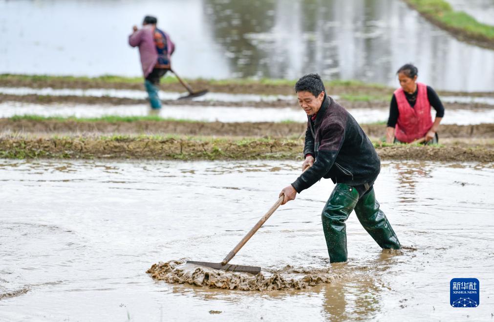 陈良东(前)与村民在水稻制种基地里平整田块,准备播种(4月6日摄)。