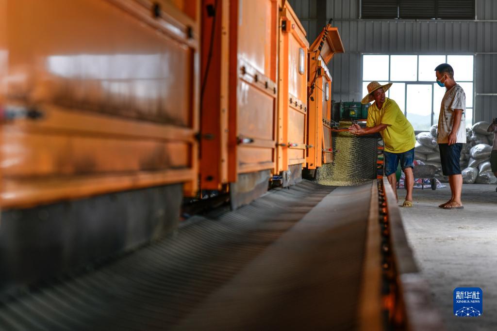 陈良东(左)在种子加工车间查看今年收获的稻种烘干情况(8月26日摄)。