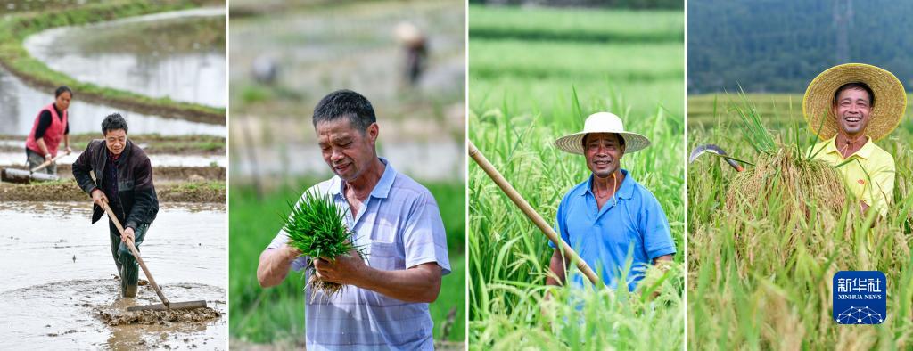 拼版照片:从左至右为4月6日,为陈良东在水稻制种基地里平整田块,准备播种;5月29日,陈良东在移栽秧苗;8月1日,陈良东在水稻制种基地里拿着竹竿,准备给制种水稻“赶花”授粉;8月26日,陈良东展示收获的水稻种子。