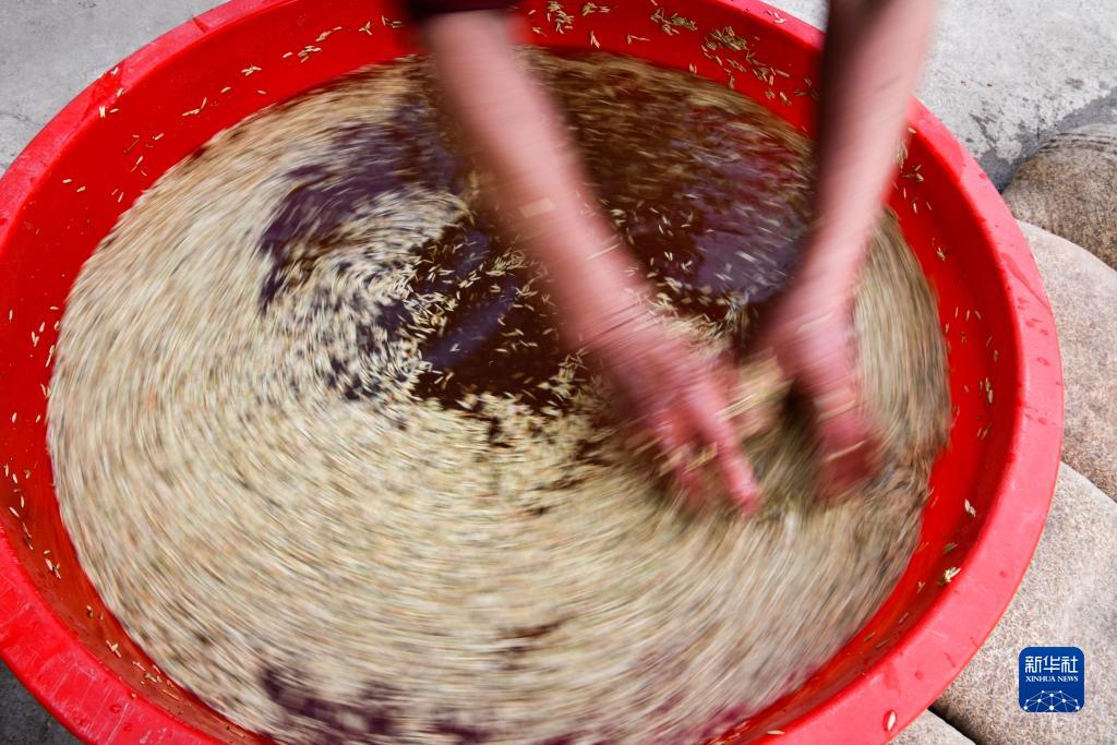 陈良东在浸泡稻种,为杂交水稻育苗做准备(4月6日摄)。
