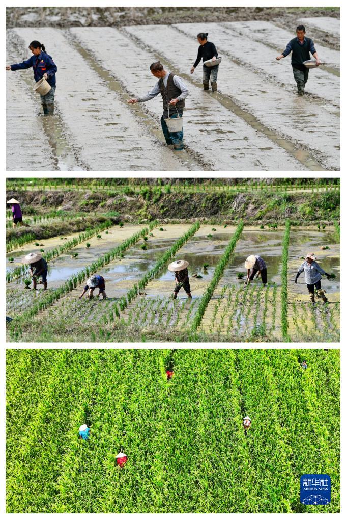 拼版照片:上图为村民在陈良东的水稻制种基地里播种(4月7日摄);中图为村民在陈良东的水稻制种基地里插秧(5月29日摄);下图为村民在陈良东的水稻制种基地里“赶花”授粉(8月1日摄,无人机照片)。