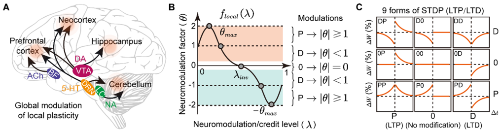 据介绍,生物系统中常见的多巴胺、血清素等神经调质物,往往经由特定的腺体释放,并远程弥散、投射到一定范围内的目标神经元群体,且根据调质浓度水平的不同,对局部的神经元可塑性、突触可塑性等产生多种复杂的调制影响。