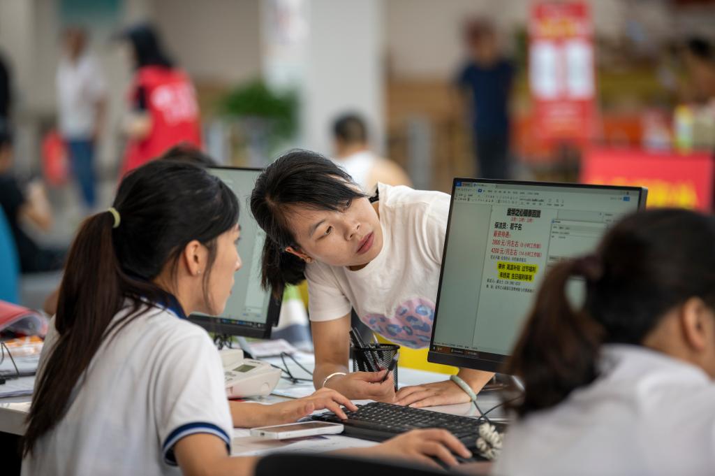 8月9日,在浙江省金华市婺城区零工服务中心大厅里,工作人员帮助求职者查找用工信息。新华社发(胡肖飞摄)
