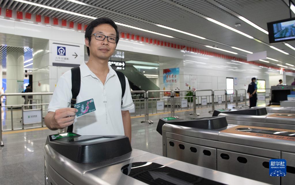 8月30日,在深圳福田站地铁闸机出口,用户持深港互通行卡准备刷卡。新华社记者 毛思倩 摄