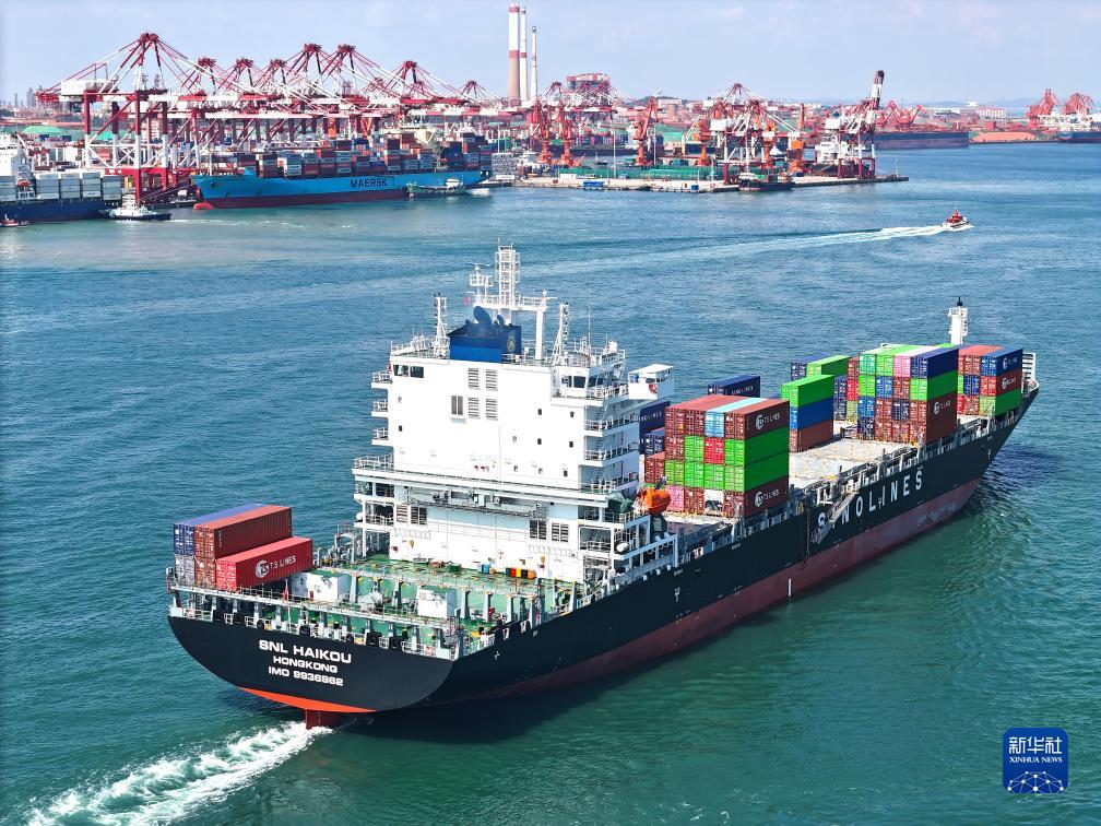 8月30日,“中外运海口”轮缓缓驶离山东港口青岛港(无人机照片)。