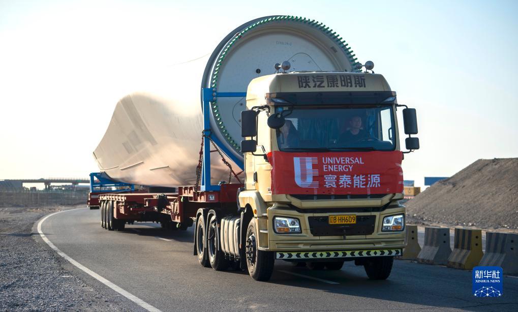 2020年4月23日,寰泰能源一批零部件跨越数千公里,奔赴哈萨克斯坦科斯塔奈州,用于50兆瓦风电项目建设。 新华社发