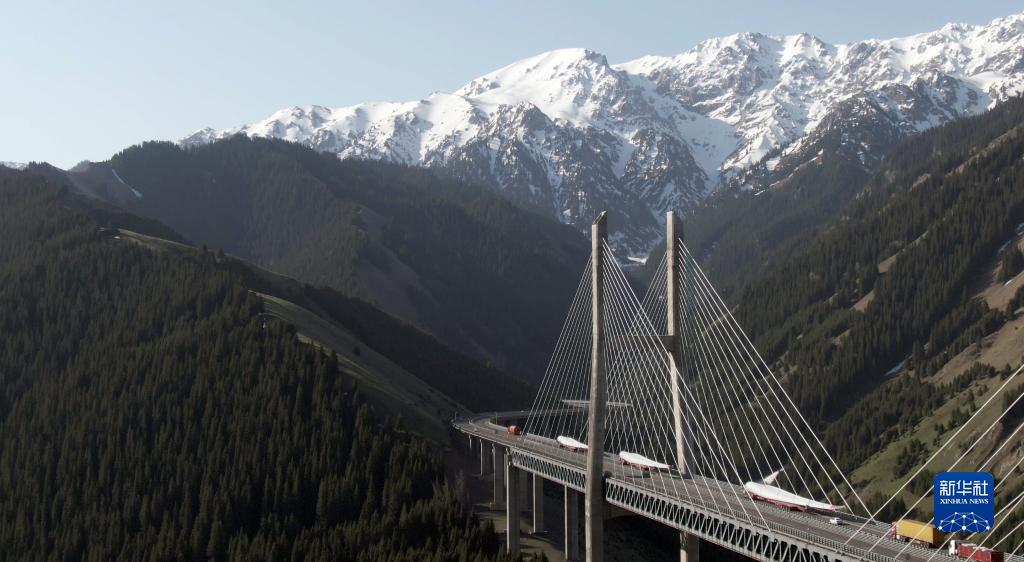 2020年4月24日,寰泰能源一批零部件经过新疆霍城县境内的果子沟大桥,奔赴哈萨克斯坦科斯塔奈州,用于50兆瓦风电项目建设(无人机照片)。 新华社发