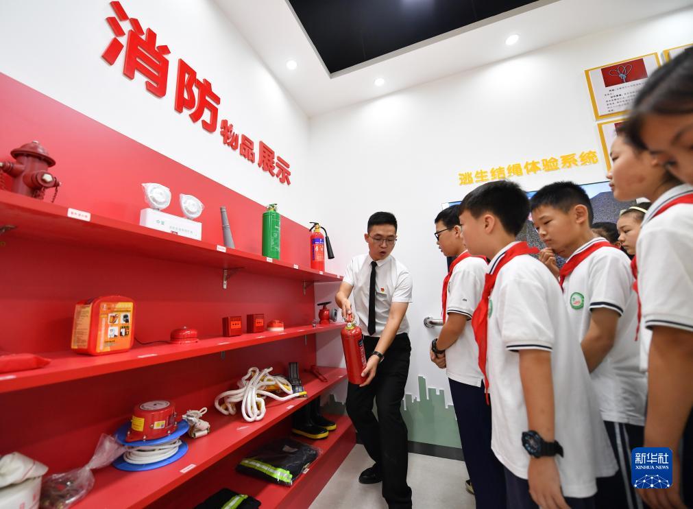 8月31日,在西安市鄠邑区新区小学,学生在老师的指导下了解消防器材使用方法。