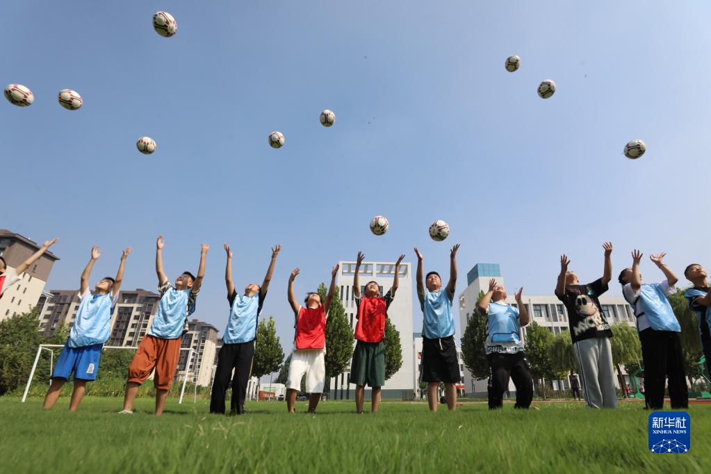 8月31日,河南省焦作市温县第四实验小学学生在体育课上学习足球技能。